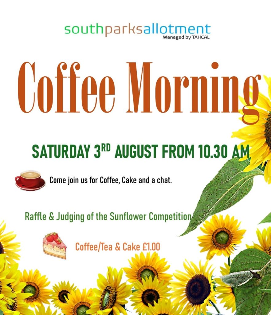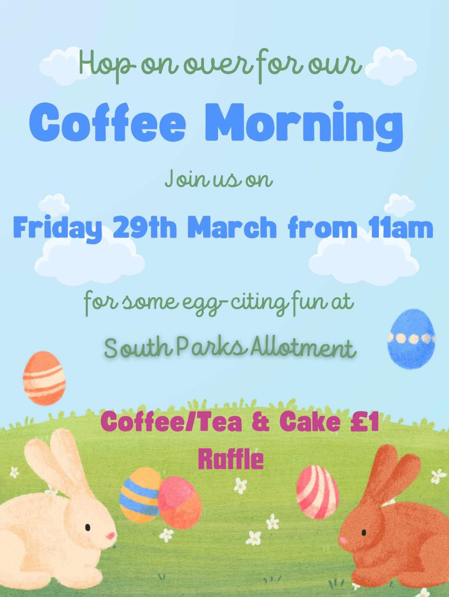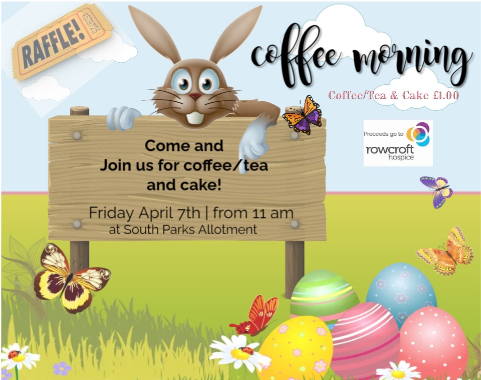 Dear members, I will be hosting a Coffee Morning on Friday 7th April (Good Friday) at 11 am on South parks allotment. I would love for you all to join me for coffee/tea ☕️ and cake. Please come and enjoy a chit chat with other members. Tea/Coffee with a cake will be £1. All proceeds will go to Rowcroft Hospice. I hope to see you all there. Thank you, Rhian 😊